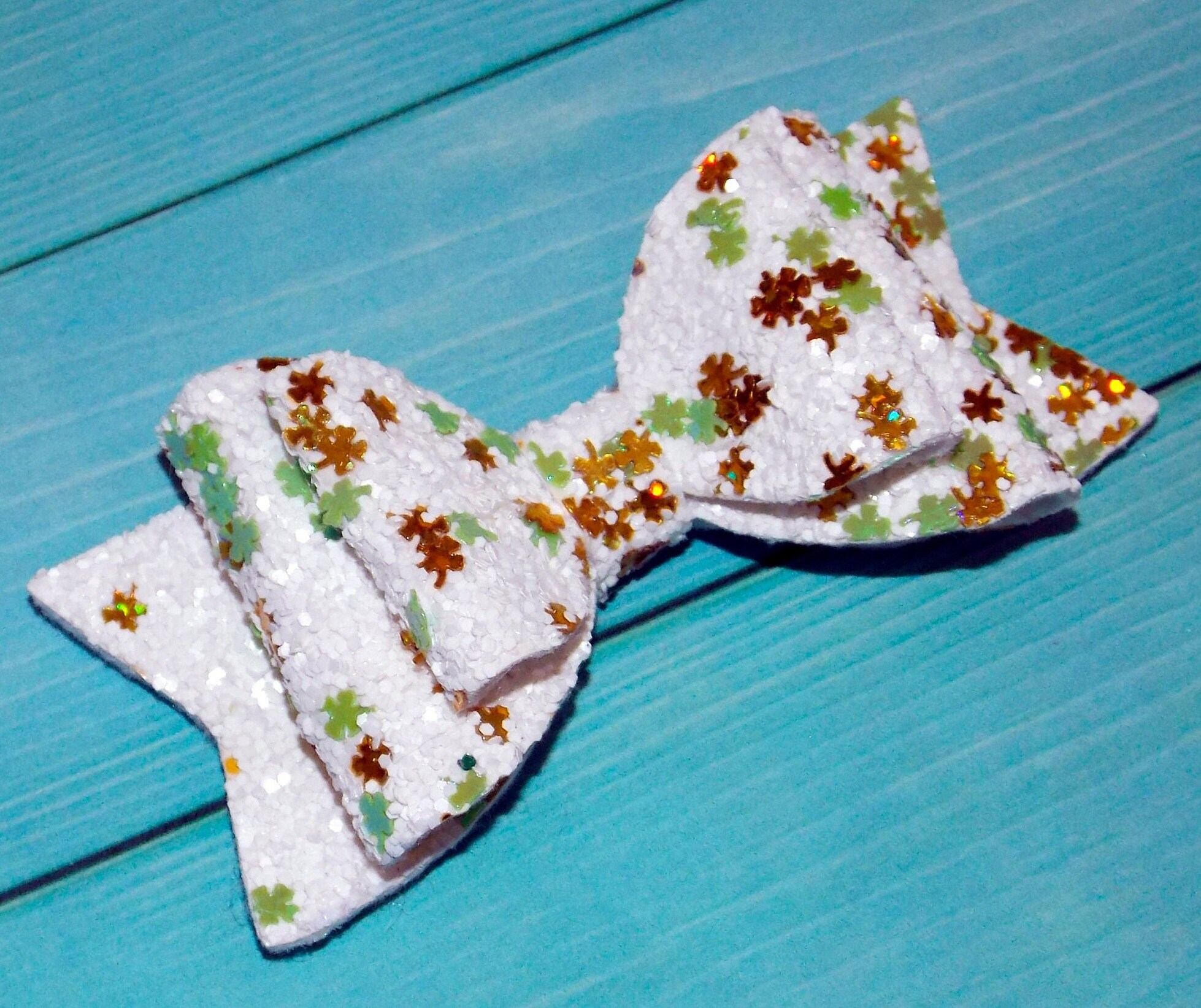 Hair Bow Leaf White,Gold and Green-Good Luck-St Patrick's Day Gift Four Leaf-Clover Toddler Four Leaf Clover-Baby Shower Gift-Glitter Bow