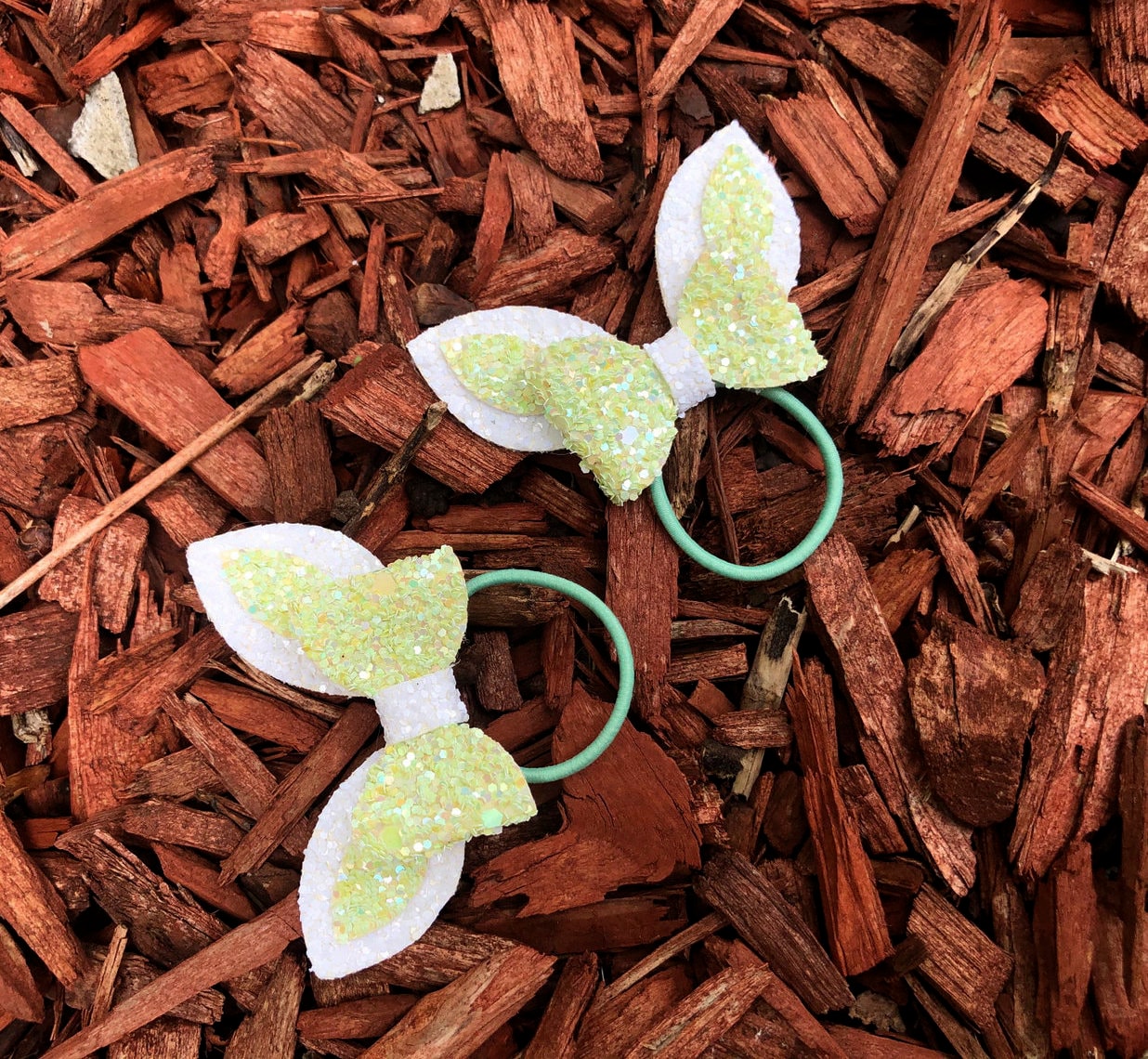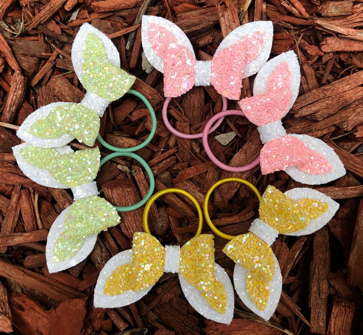 Set of 2 Bunny Ears Small or Large Elastic Hair Bows,Easter Glitter White and Pink,Yellow and Green,Double Stacked Bows Sparkle