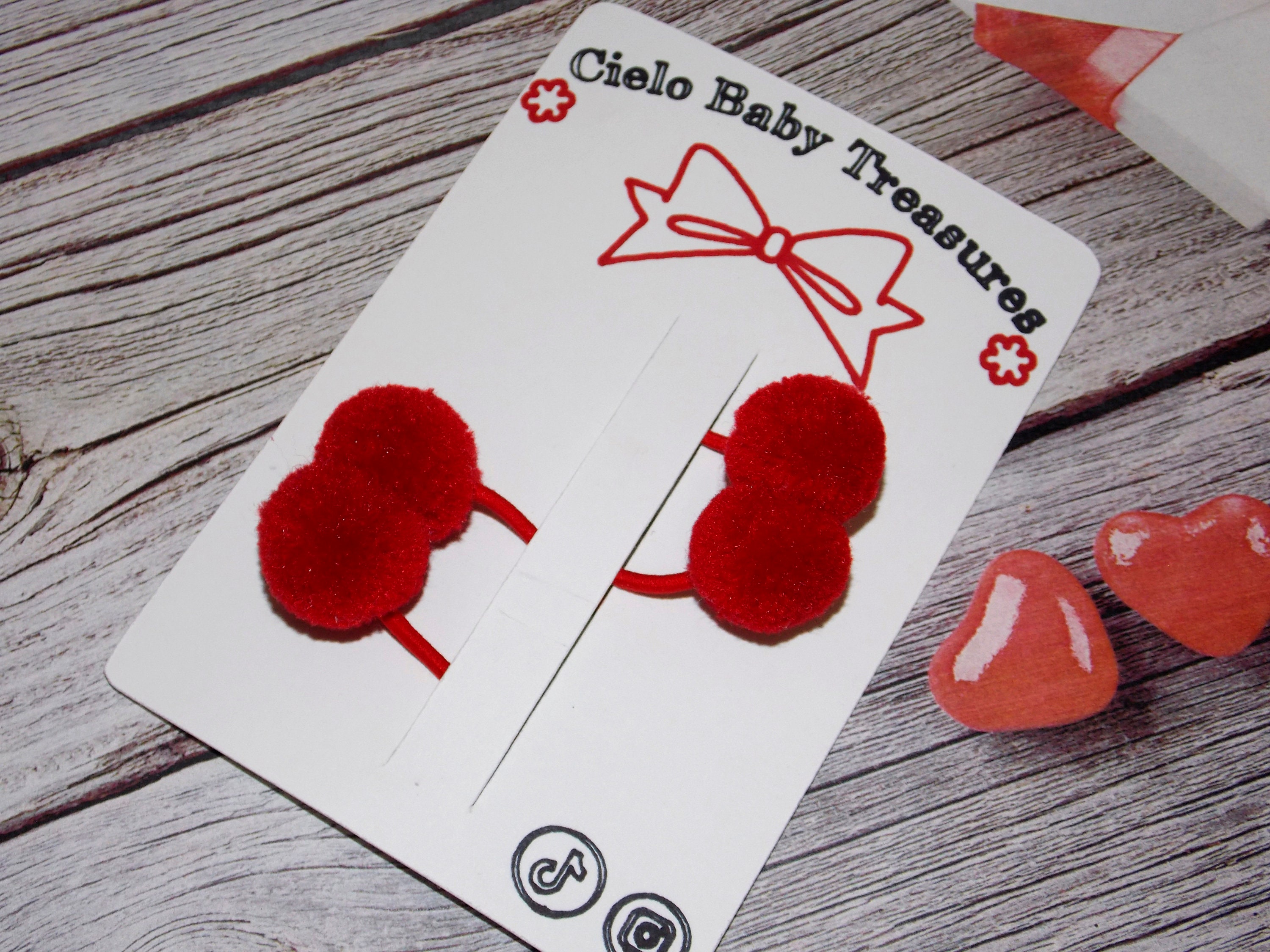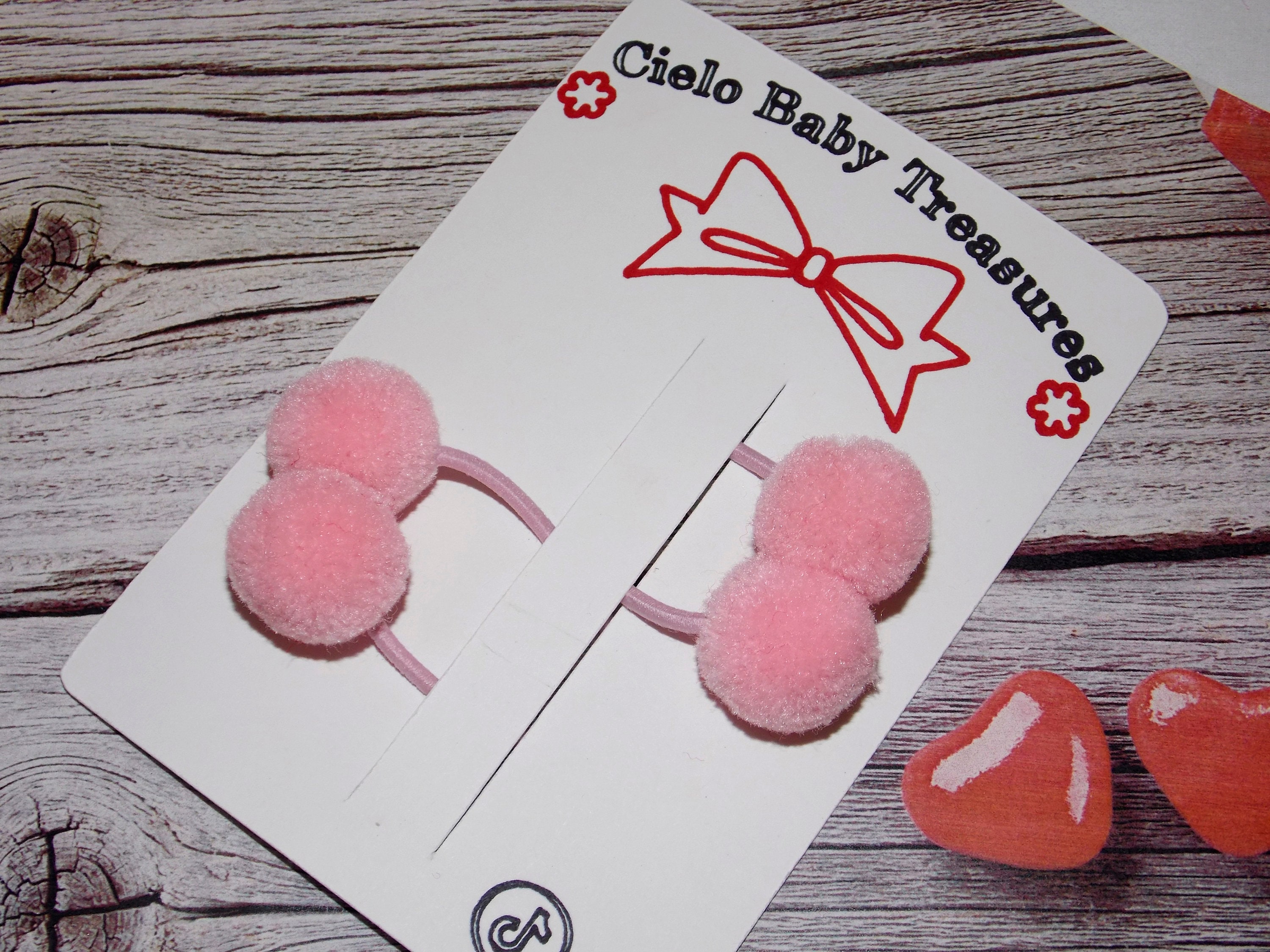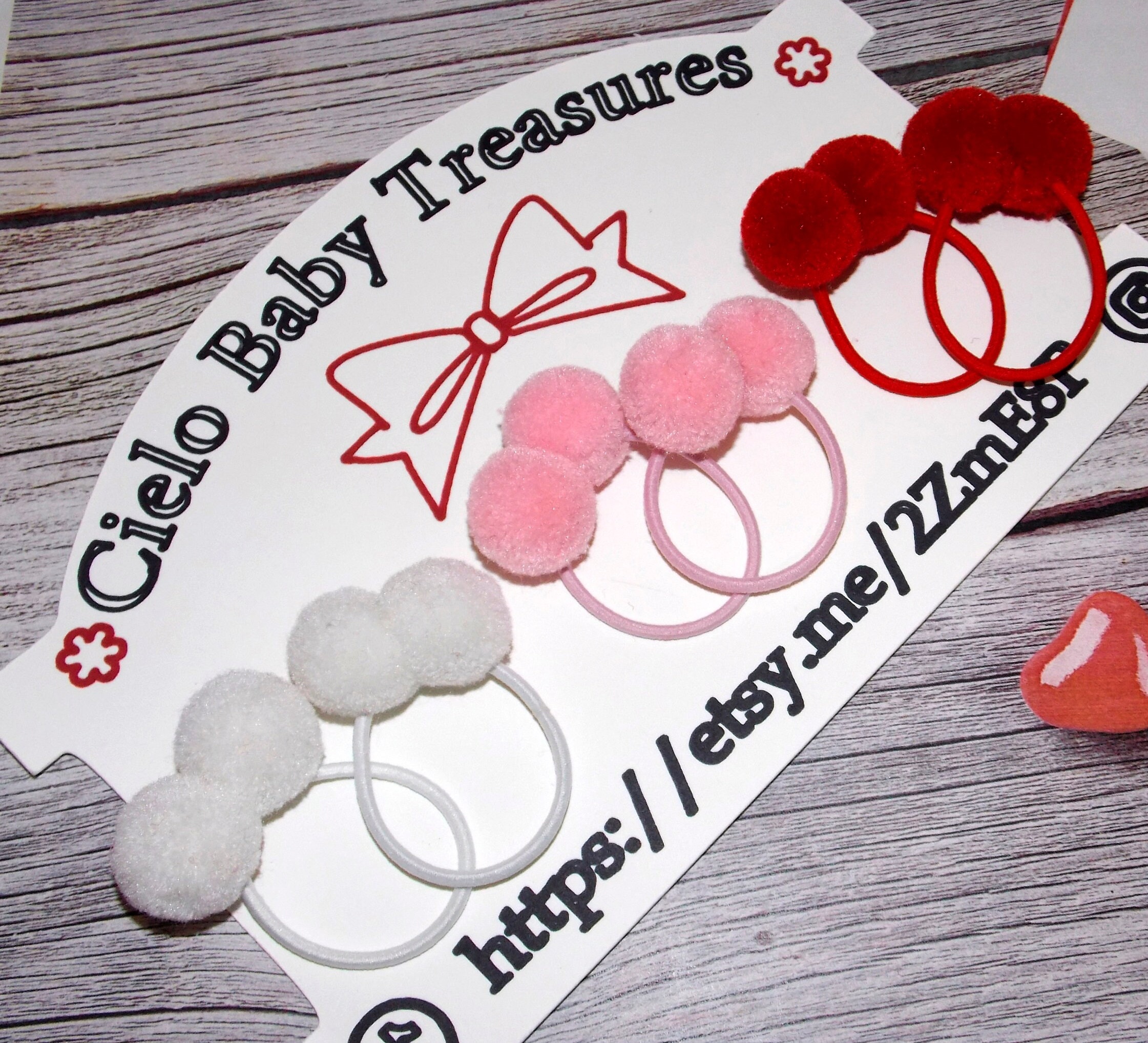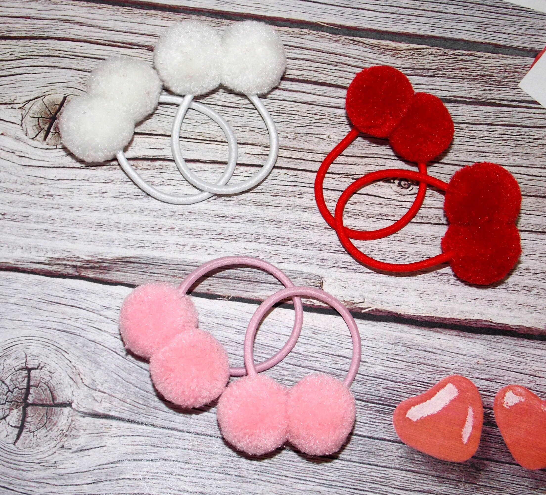 Set of 2 Elastic Bands with POM POM-Valentine's Day POM POM Red, Pink and White/Hair Accessories for Baby Girls-Parties.