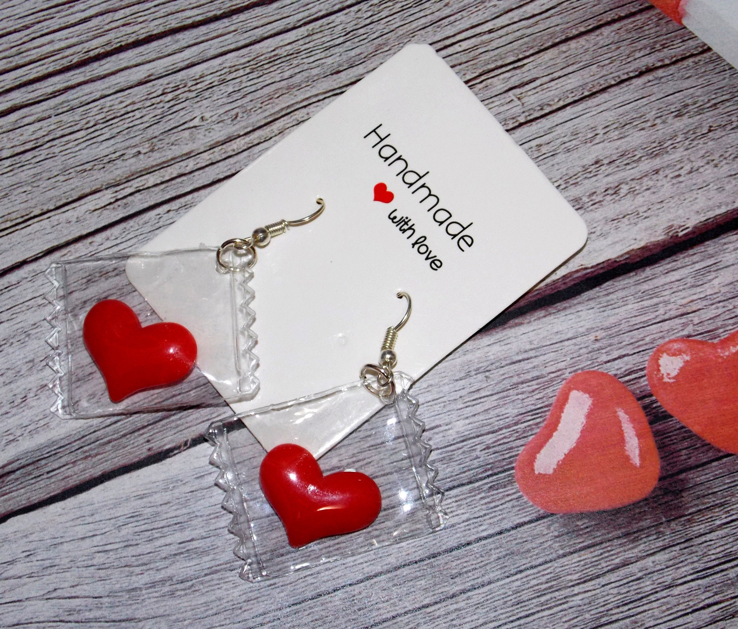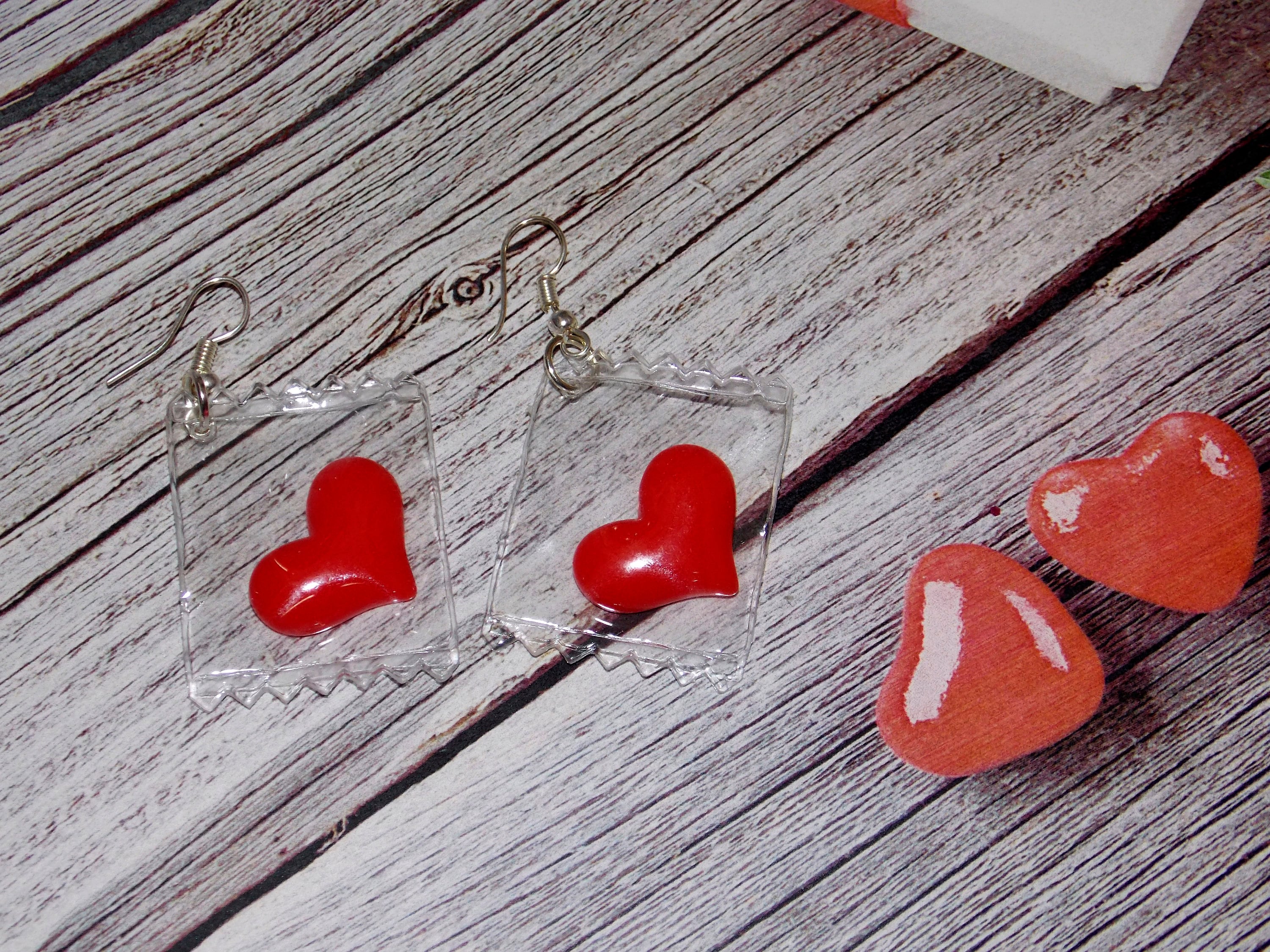 Earrings with plastic cover and a centered red Heart-Earrings Valentine’s Day-Love Earrings Valentine’s Day-Heart Stud Earrings, Red hearts stud earrings, valentines earrings, Valentine’s Day, heart earrings, Heart earrings, Shaker earrings.