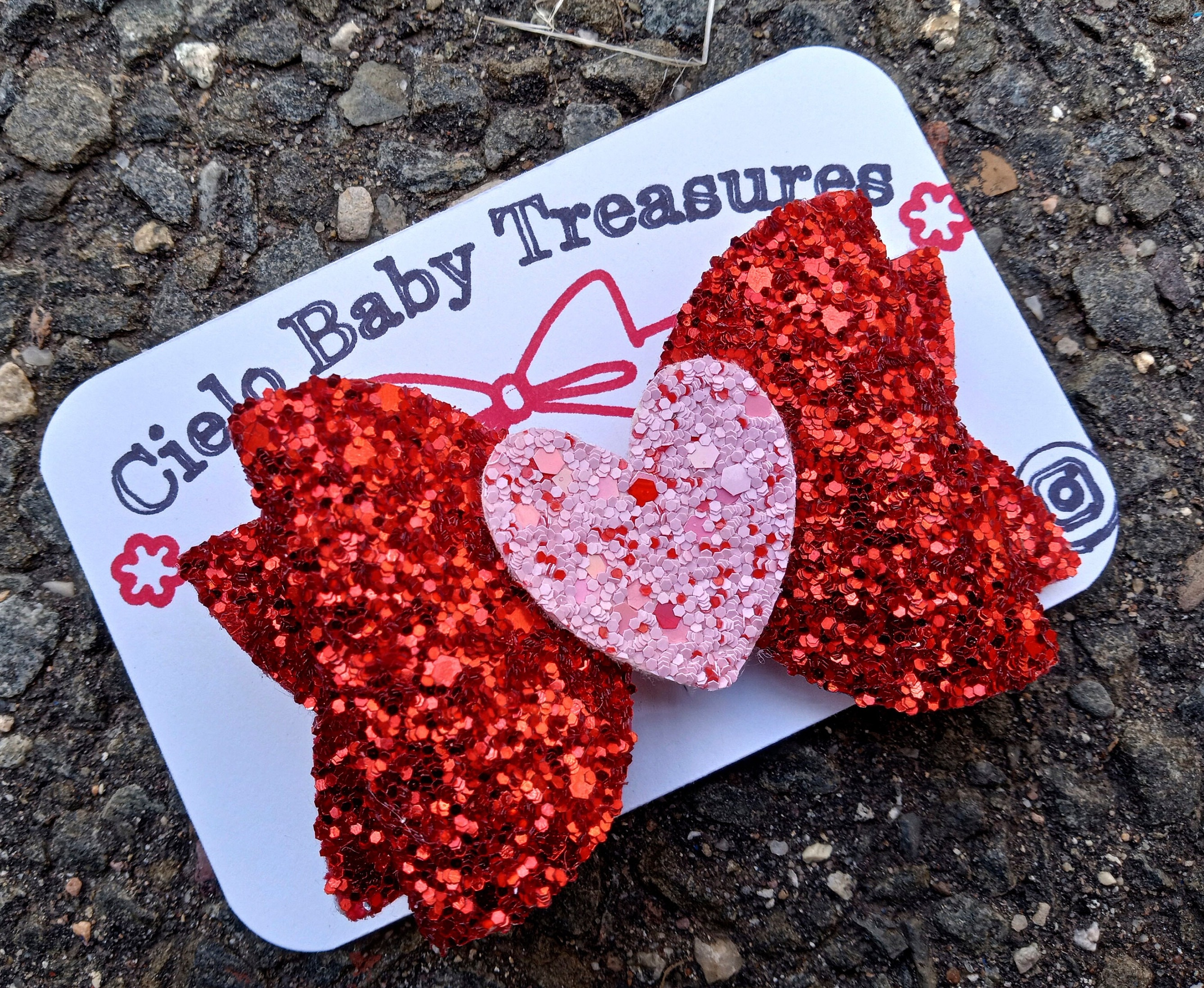 LOVE My First Valentine Day Baby Hair Bow-Hair Bow Red With Heart- Glitter Chunky Bow- Hair Bow-headband white, Red & Pink Double Stacked Glitter.