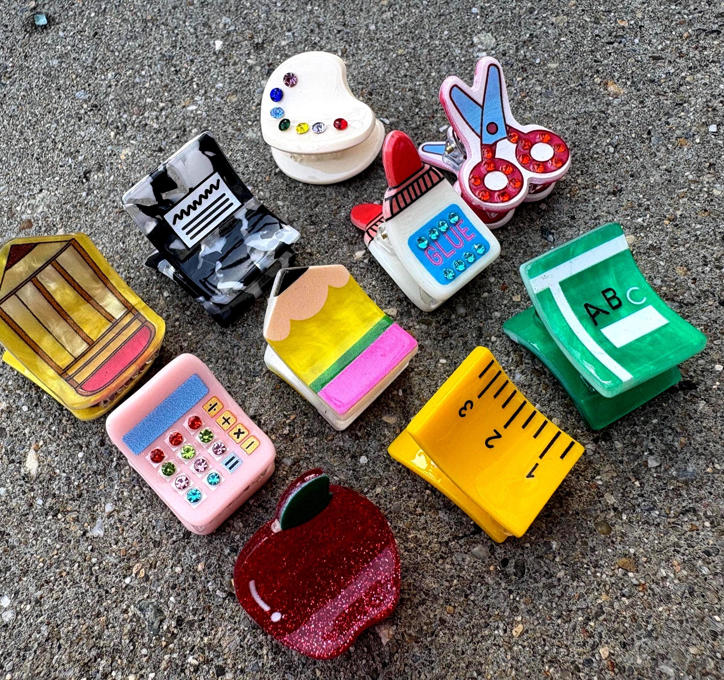 Hair Back to School-Resin Crayon, Pencil, Calculator, Apple, School Bus-Clips for Girls First Day of School-Plastic Barret-School Supply Hair Clips-ABC Clip-Glitter. BACK TO SCHOOL Crayon Hair Clip, First Day of School Bow, Teacher Gift, Back to School Gift, Girls Hair Clips, Set of 2 Small Plastic Hair Back to School, Pencil, School Bus, Notebook, Scissors, ABC and School Bus-Acrylic Clip Teacher Gift-Resin Hair Clip Crayon Acrylic Clip, Pencil Hair Clip | Glitter Hair Clips for Girls | Gifts for Girls | Resin Hair Clip | Back to School.