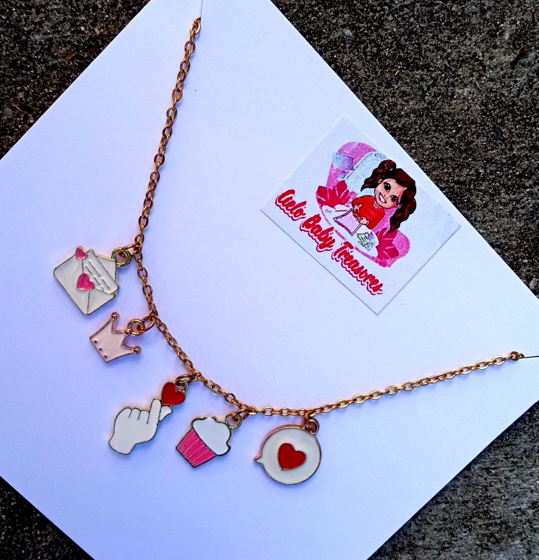 🎀 Necklace with Charms, Love letter envelope, crown, hand of love, cake and circle with heart.