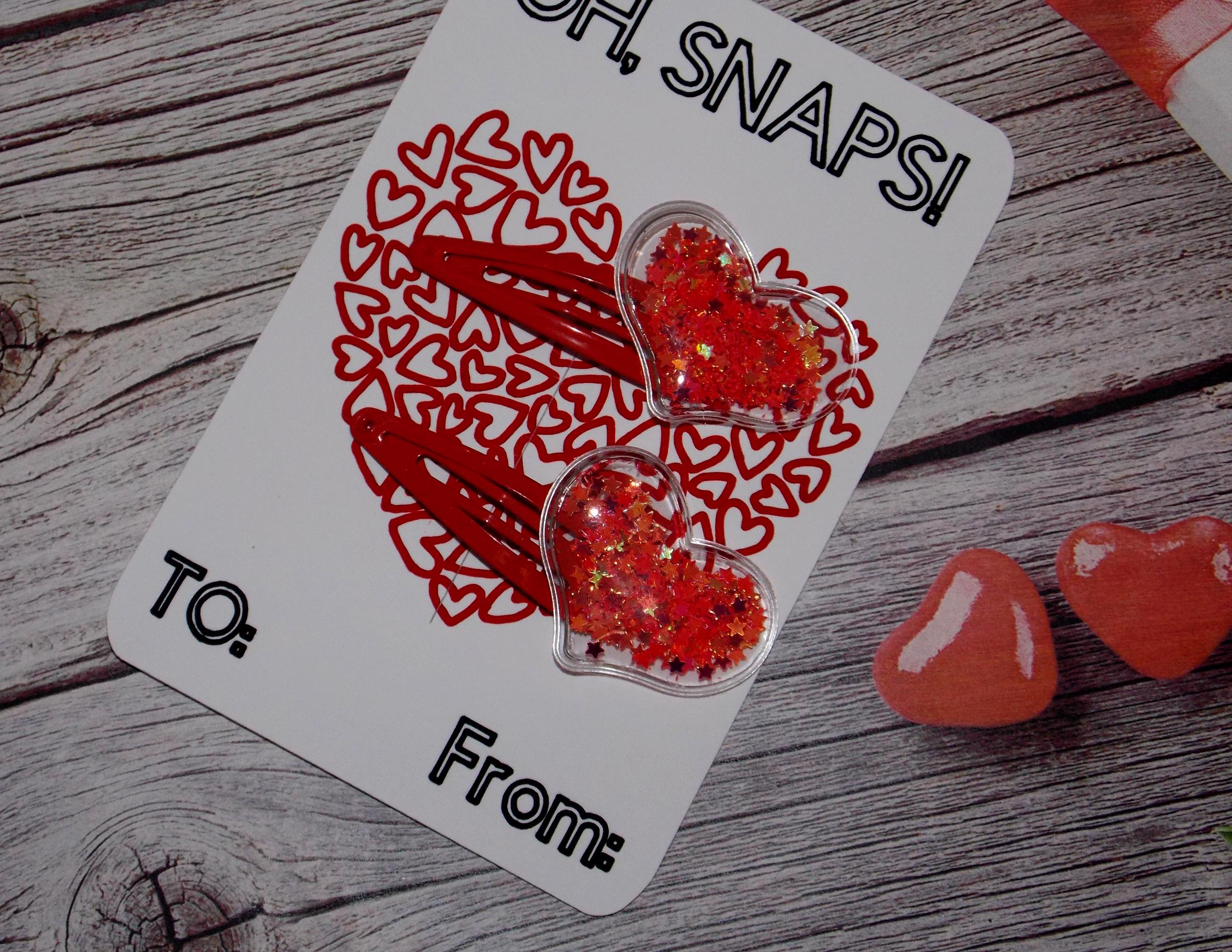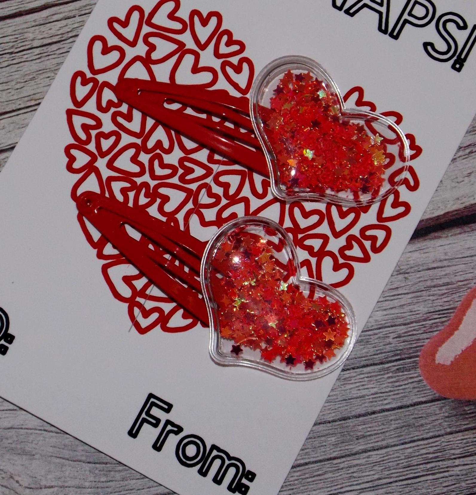 Set of 2 Red Snap Clips with Shaker Hearts-TO FROM-Valentine’s Day-Confetti Clip-Baby Clip- Barrettes-Toddler Clip-Accessories-Not Slippery