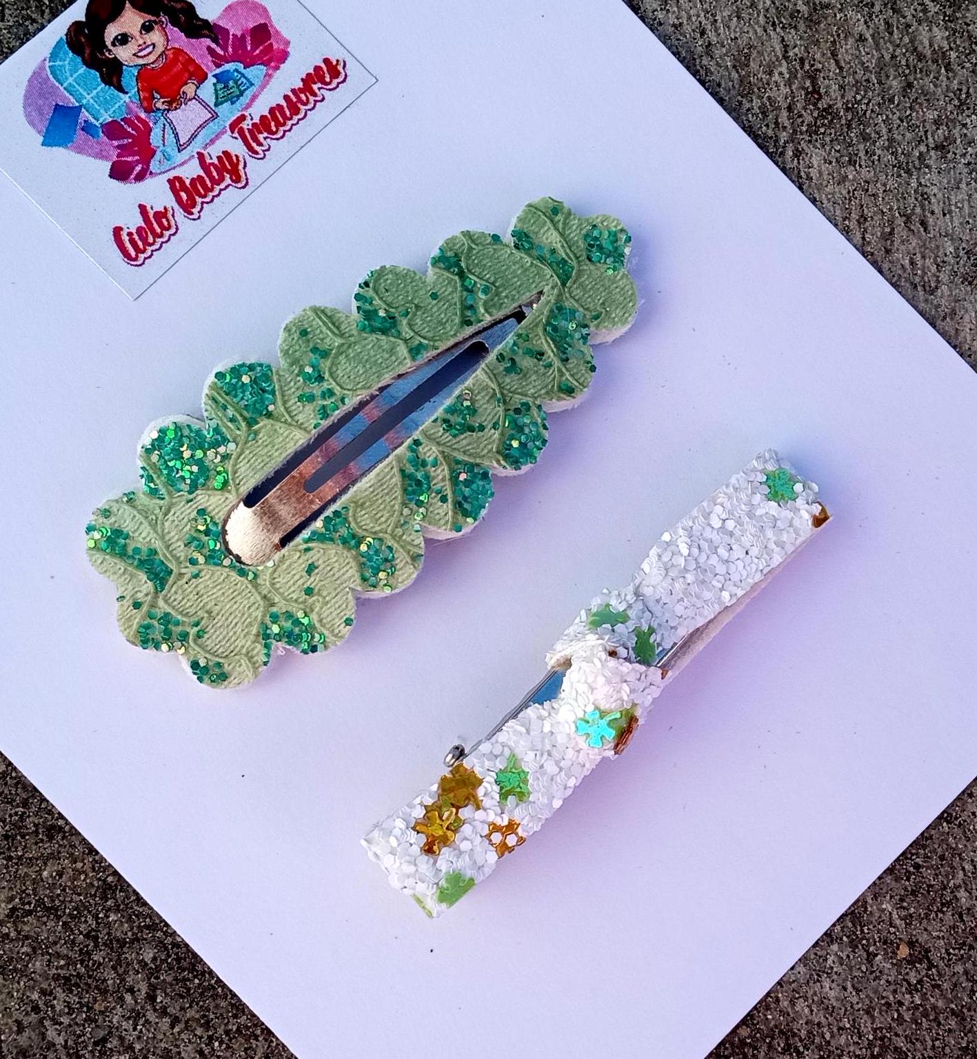 Set of 2 St Patrick’s Day Alligator Clip-Birthday Baby fringe Girls Three Leaf Clover Stud-Green,Gold,White -Hairpin Faux-Holiday Kid-
