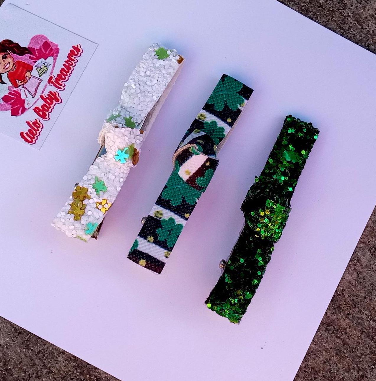 Set of 3 St Patrick’s Day knot Alligator Clips-Glitter Birthday Baby fringe-Clip lined Three Leaf Clover Stud-Green,Gold,White-Hairpin Faux