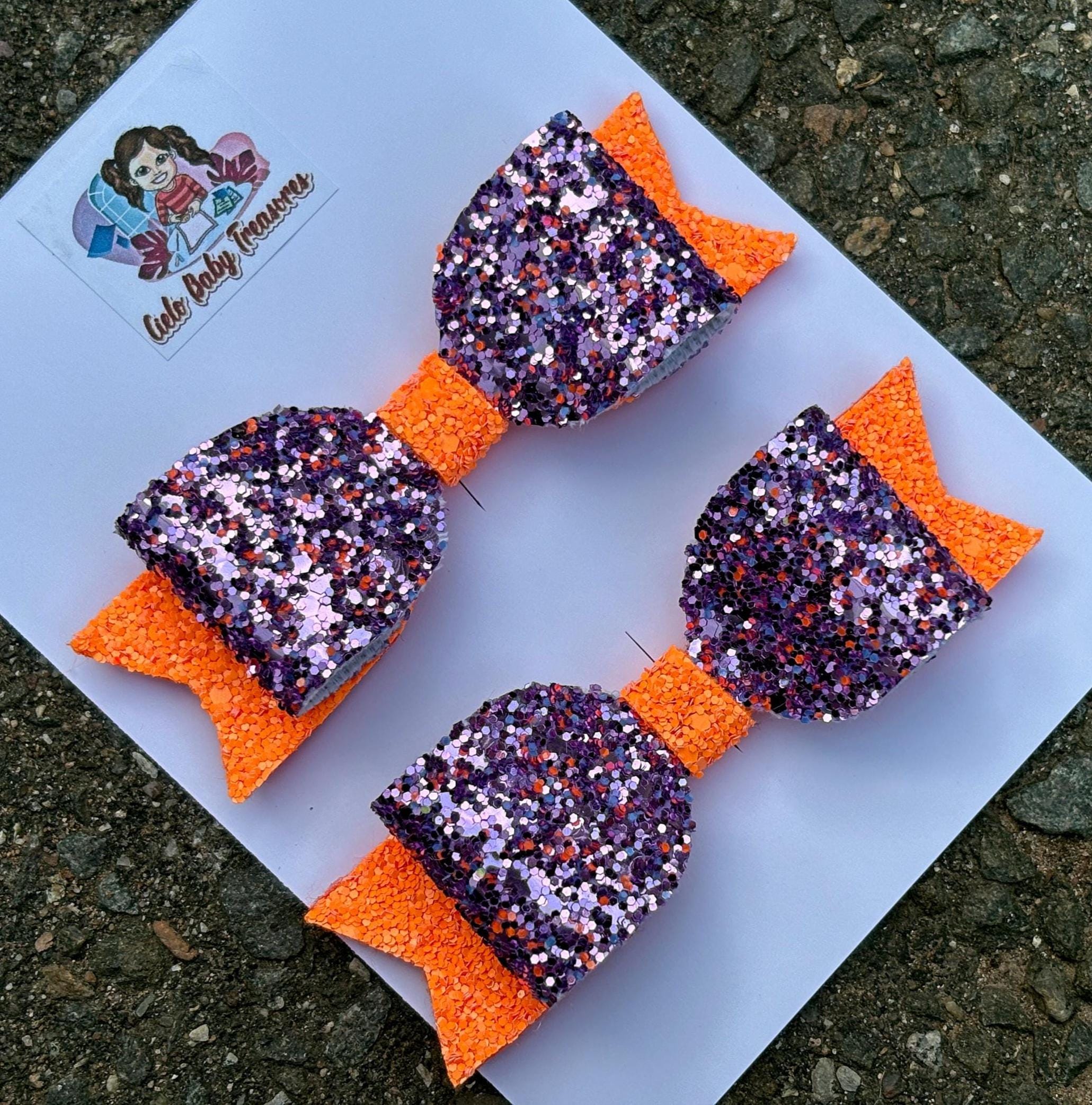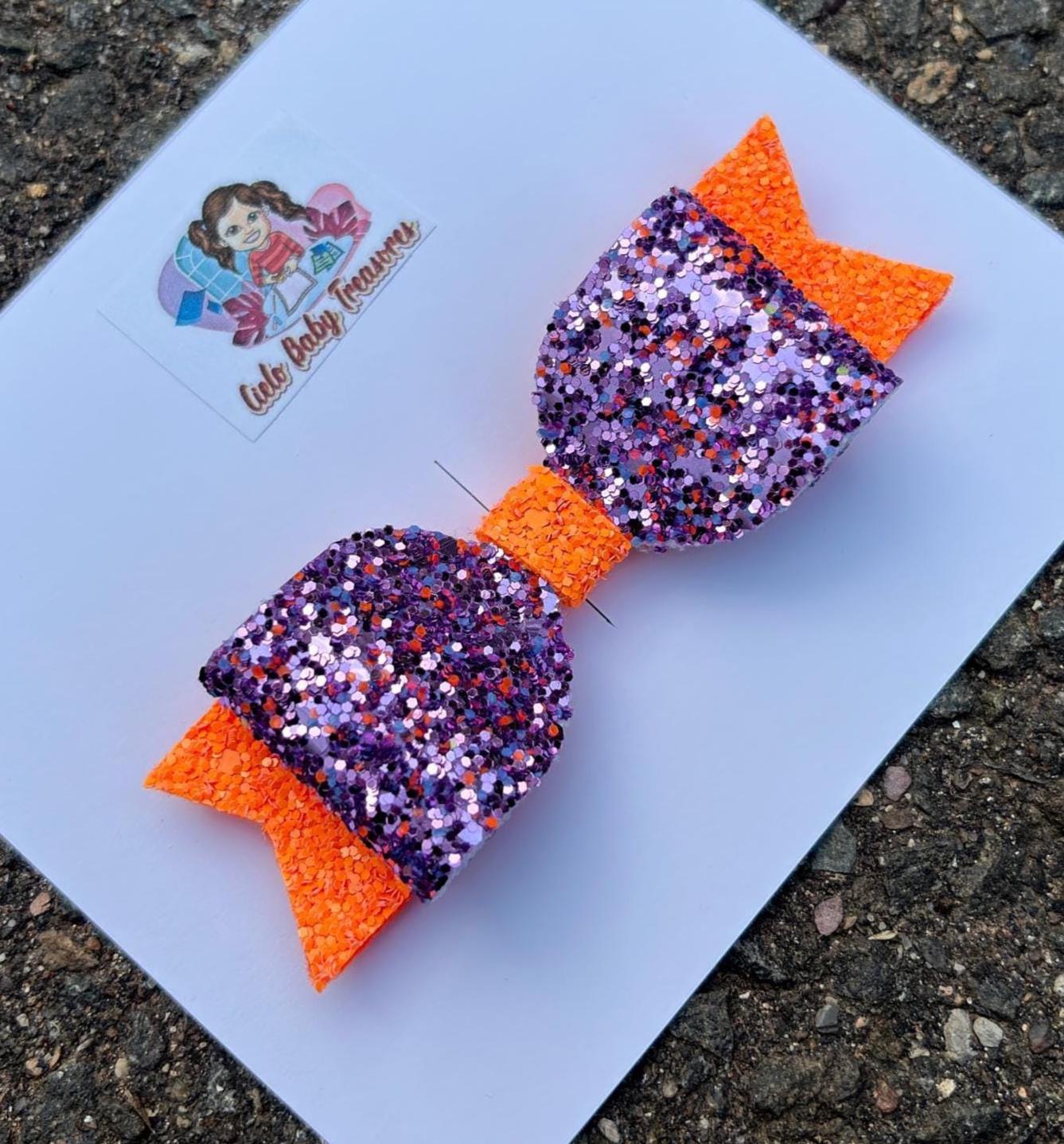 Double Stacked Set of 2-Orange,Black and Purple-Glitter Pigtail Hair Bows