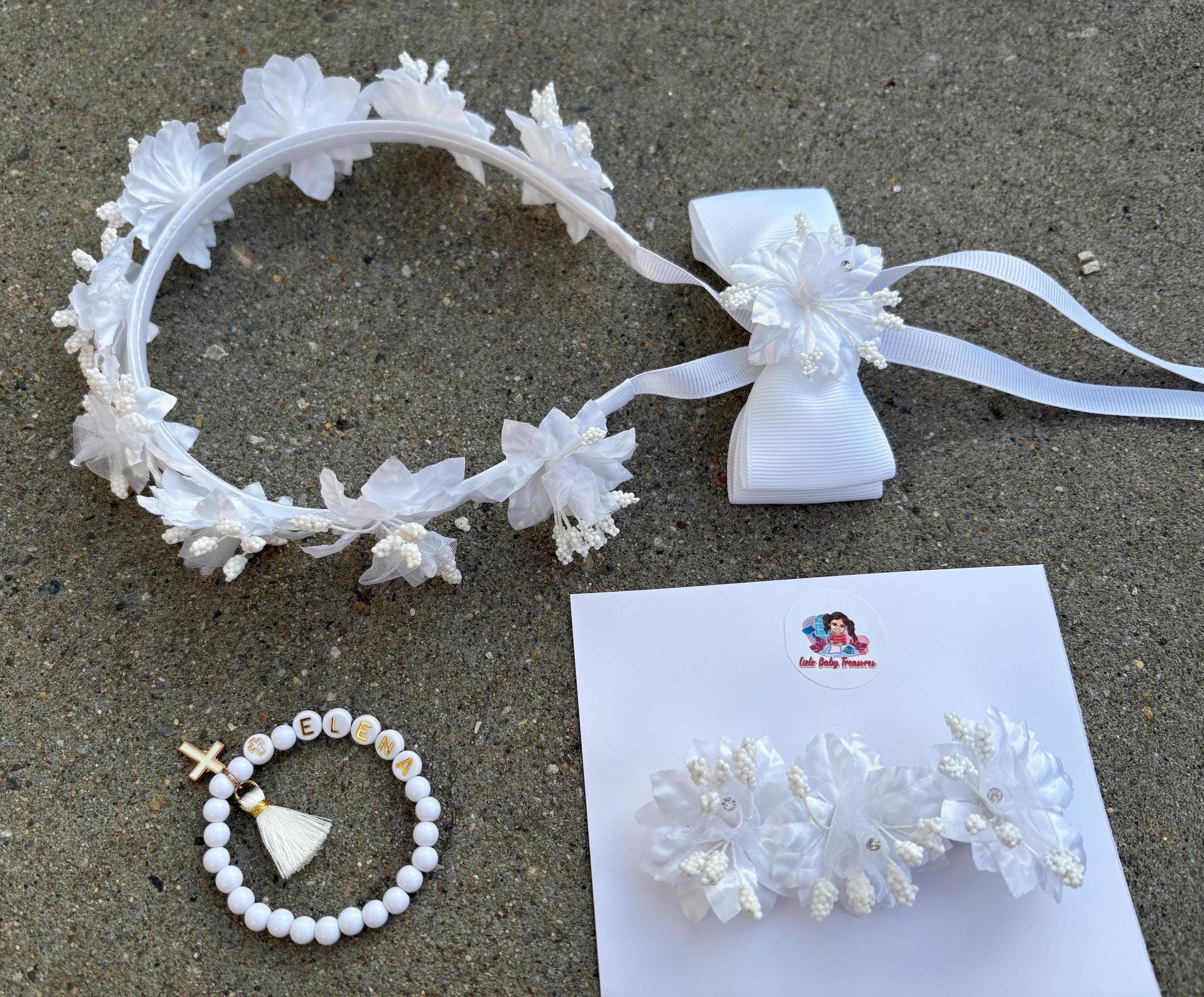First Communion Flowers Crown with Rhinestone Cross, Bracelet Baptism Headpiece, Wedding Ceremony Accessory